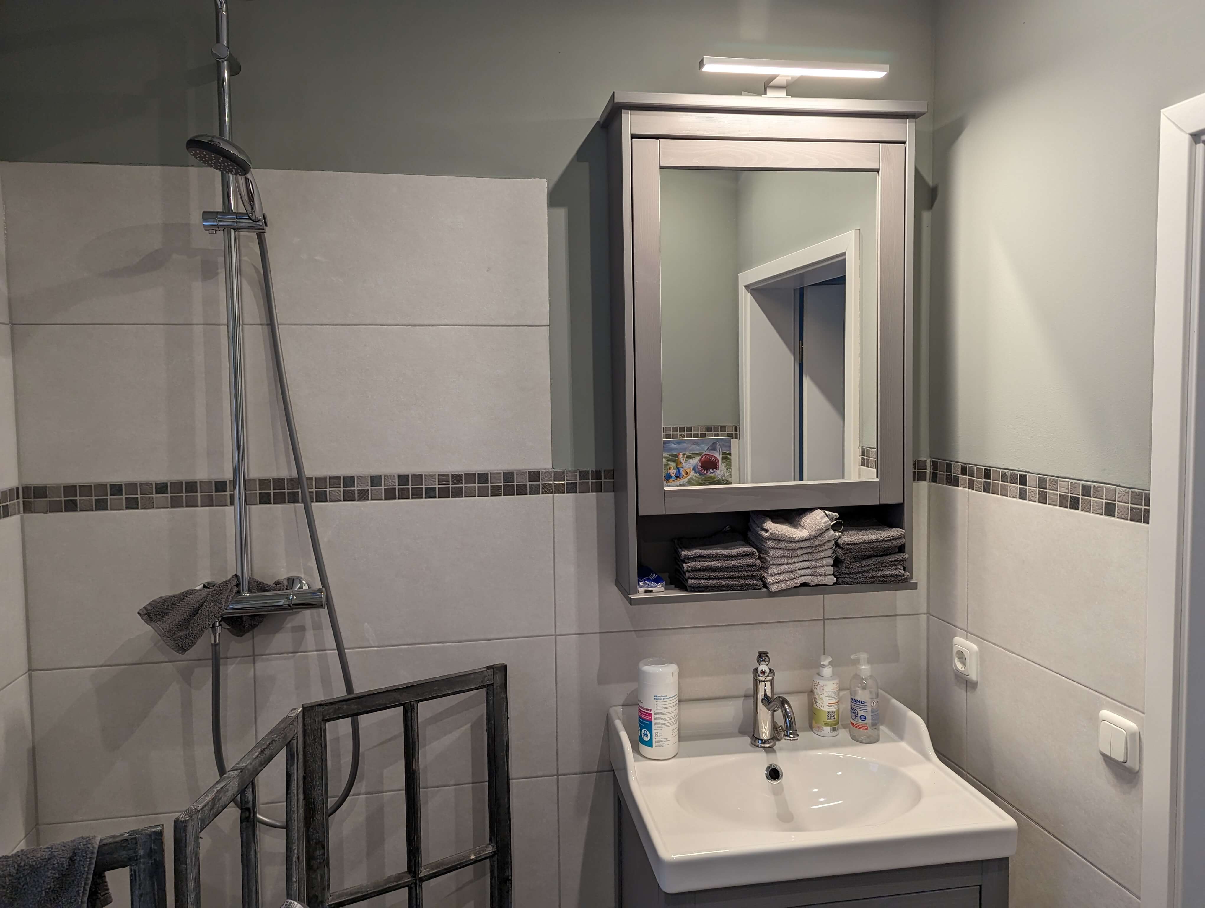 Die Badezimmer (eins im OG, eins im EG) verfügen über eine klare, ruhige Gestaltung mit neutralen Fliesen und modernen Sanitäranlagen. Eine geräumige Dusche und ein gut beleuchteter Spiegelbereich sorgen für Komfort und Bequemlichkeit. Praktische Ablageflächen und saubere Linien schaffen eine entspannende Atmosphäre.