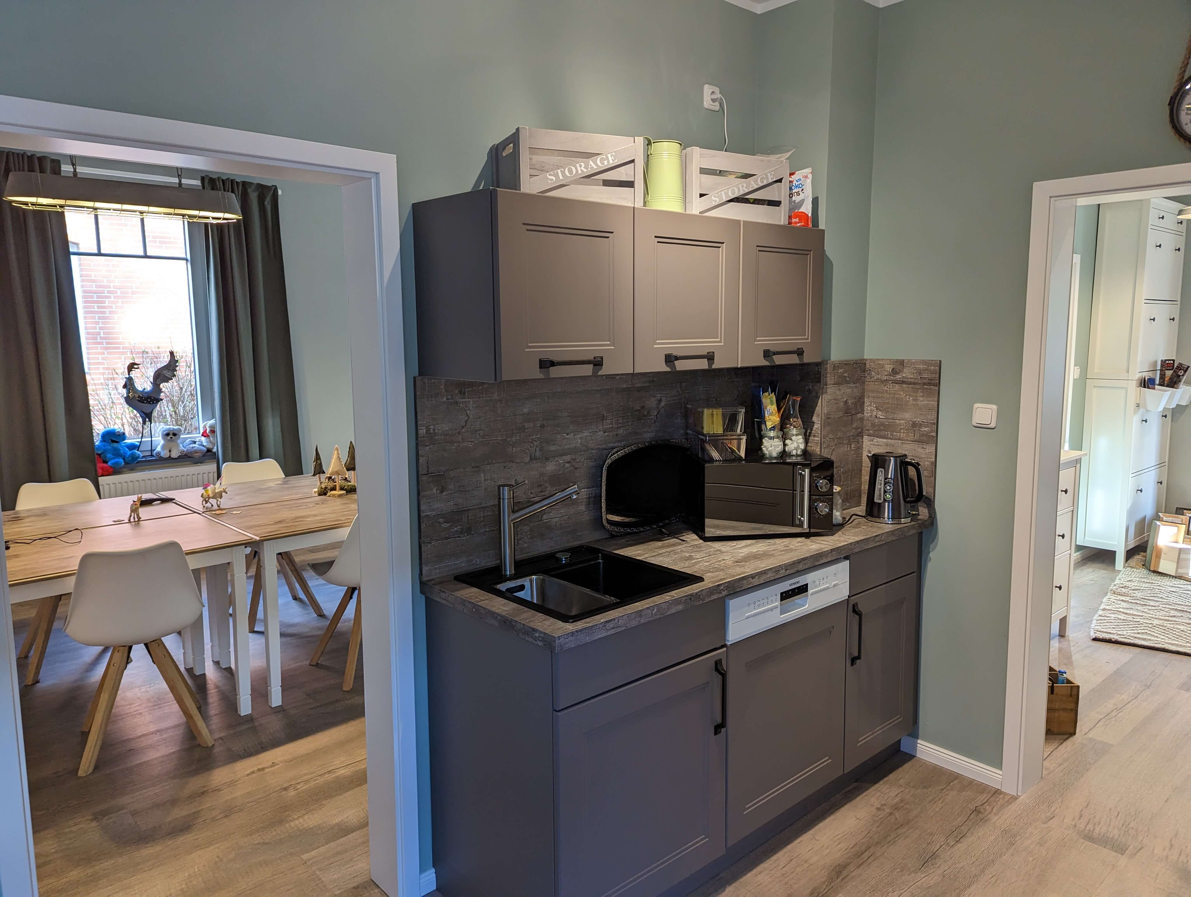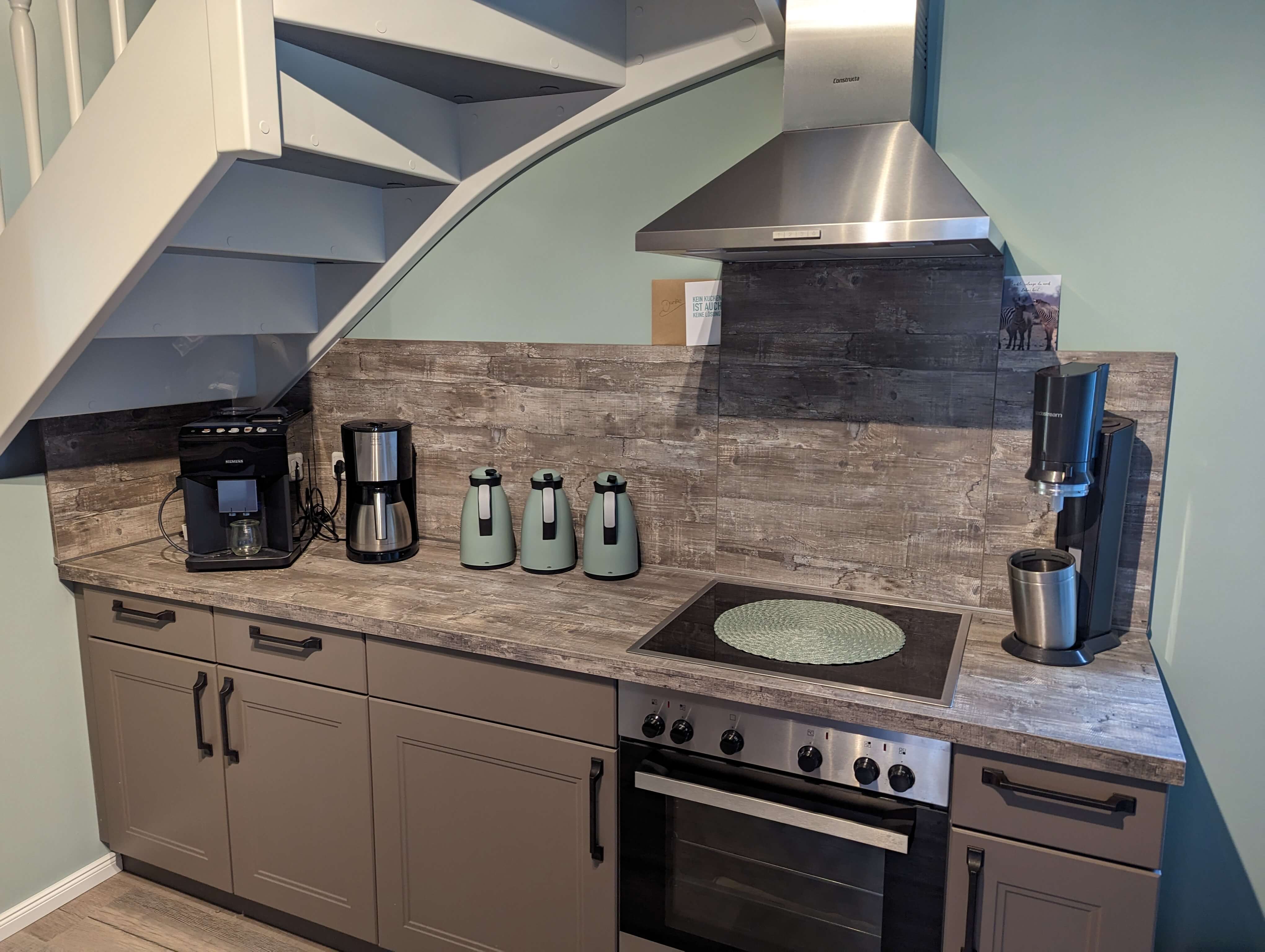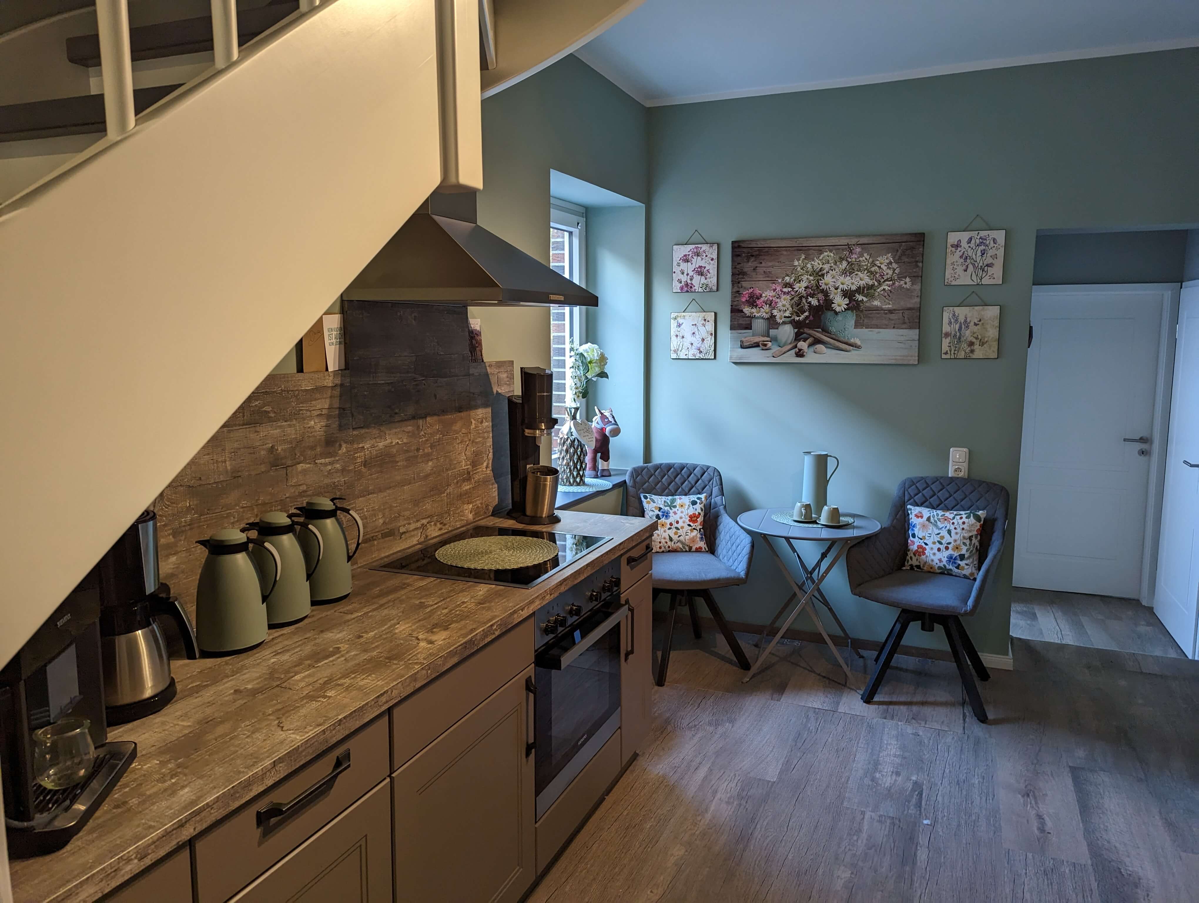 Die Küche ist modern und funktional gestaltet, mit hellen, beruhigenden Farbtönen und Holzakzenten, die eine entspannte Umgebung schaffen. Ausgestattet mit einer fortschrittlichen Kochzeile, einschließlich eines Kochfelds und eines Backofens, sowie einem Kaffeevollautomaten, bietet dieser Raum die perfekte Gelegenheit für kulinarische Kreativität oder gesellige Kaffeepausen.