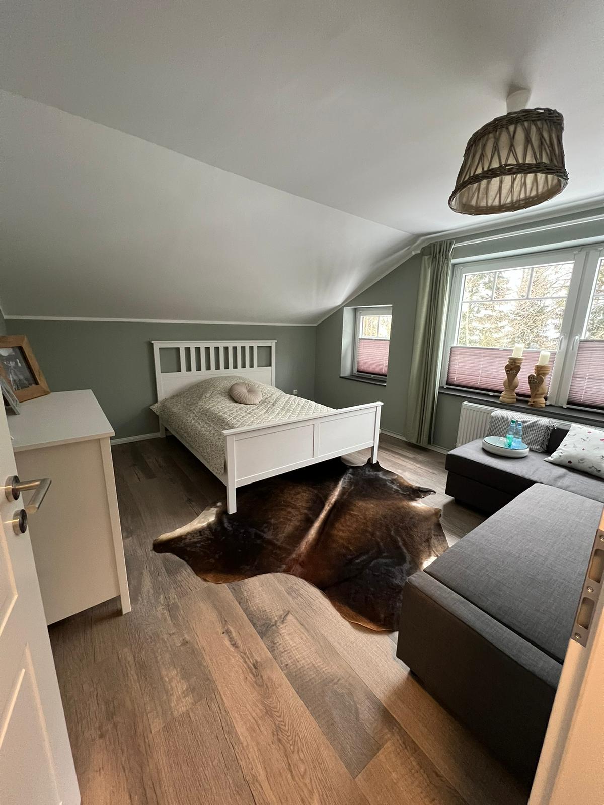 Die Schlafräume sind mit bequemen Betten und weicher Bettwäsche ausgestattet, um einen erholsamen Schlaf zu gewährleisten. Die Zimmer verfügen über genügend Stauraum und eine gemütliche Sitzecke. Große Fenster bieten eine schöne Aussicht und lassen viel Tageslicht herein, was die Räume warm und einladend macht.