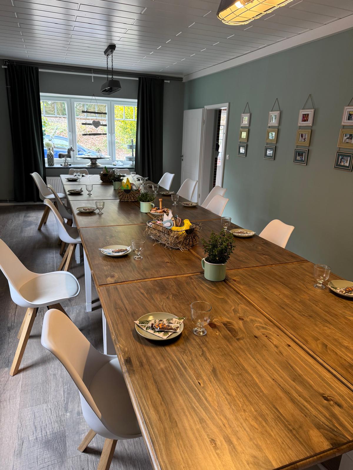Professioneller Seminarraum für bis zu 16 Personen mit großem Bildschirm, Flipboard und modernster Technik. Vollausgestattete Küche und gemütliche Schlafplätze für bis zu 9 Personen in drei Schlafzimmern.
